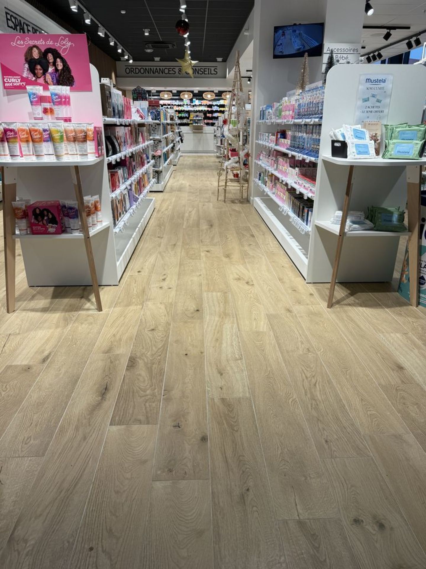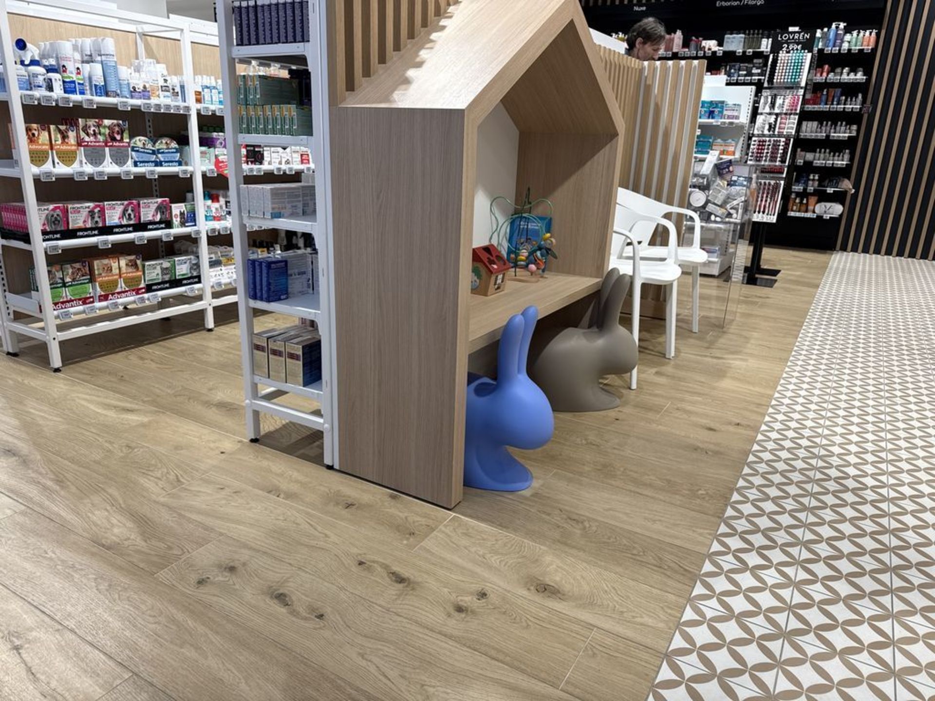 Nous y avons réalisé la pose de deux formats de carrelage, ainsi que de PVC pour l'étage et les réserves. Le tout dans le respect du planning.